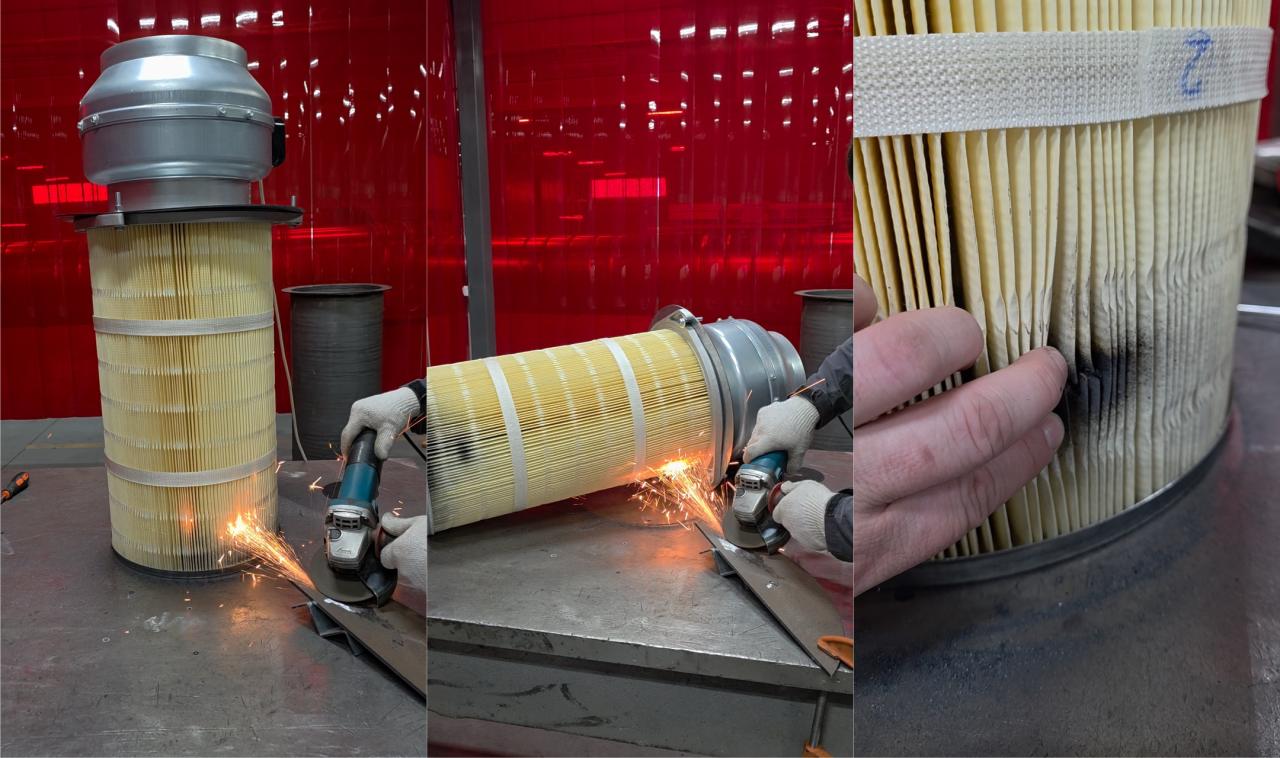 В стандартных решениях по аспирации, перед фильтровентиляционным оборудованием устанавливается фильтр искрогаситель, который препятствует прямому попаданию искр, обеспечивая защиту и предотвращая возможность возгорания. В случае, если в систему вентиляции не установлены фильтры предварительной очистки, искры могут попасть непосредственно на фильтрующий картридж. Поэтому, очень важно правильно подобрать фильтрующий материал со специальным составом, в нашем случае был использован материал – композит с огнеупорной пропиткой.
