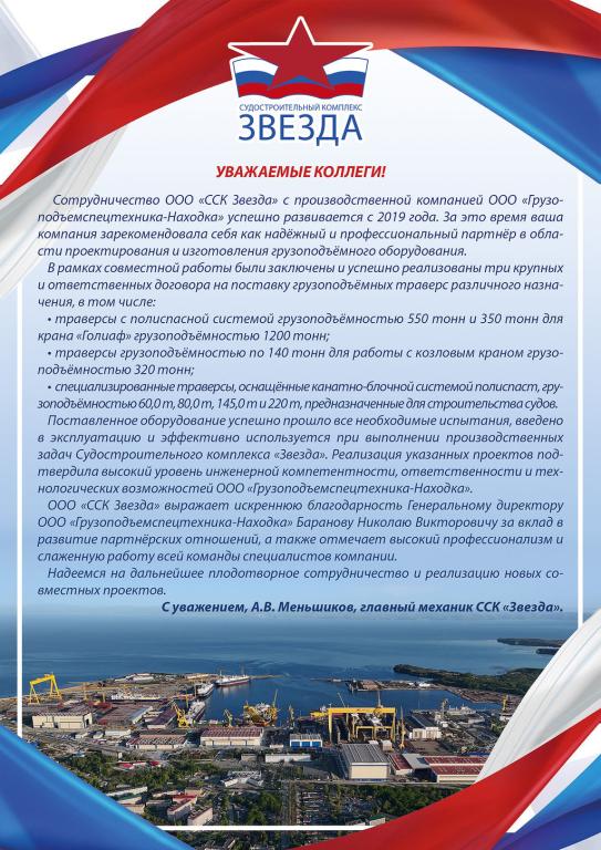 ООО «ССК «Звезда» направило благодарственное письмо в адрес руководства и коллектива ПРИМОРСКОГО КРАНОВОГО ЗАВОДА за добросовестный и профессиональный подход к выполнению комплекса крановых работ на территории Заказчика.