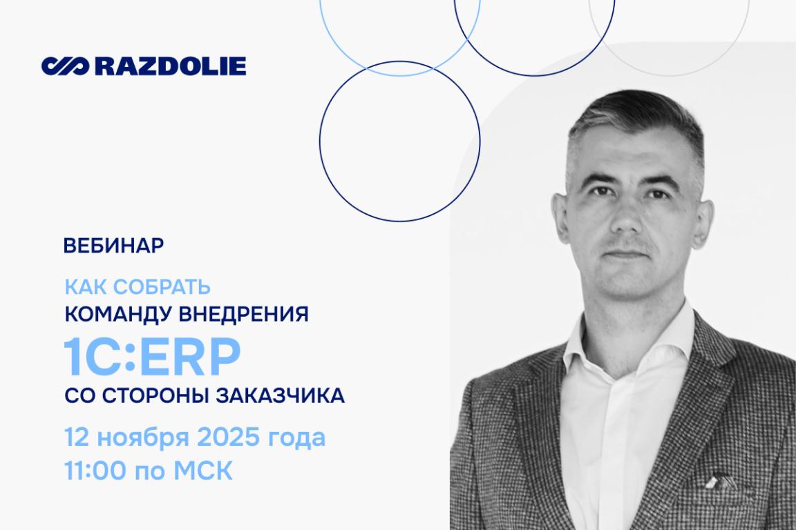 Внедренческий центр «Раздолье» анонсирует проведение бесплатного вебинара «Как собрать команду внедрения 1C:ERP со стороны заказчика», который состоится 12 ноября 2025 года в 11-00.