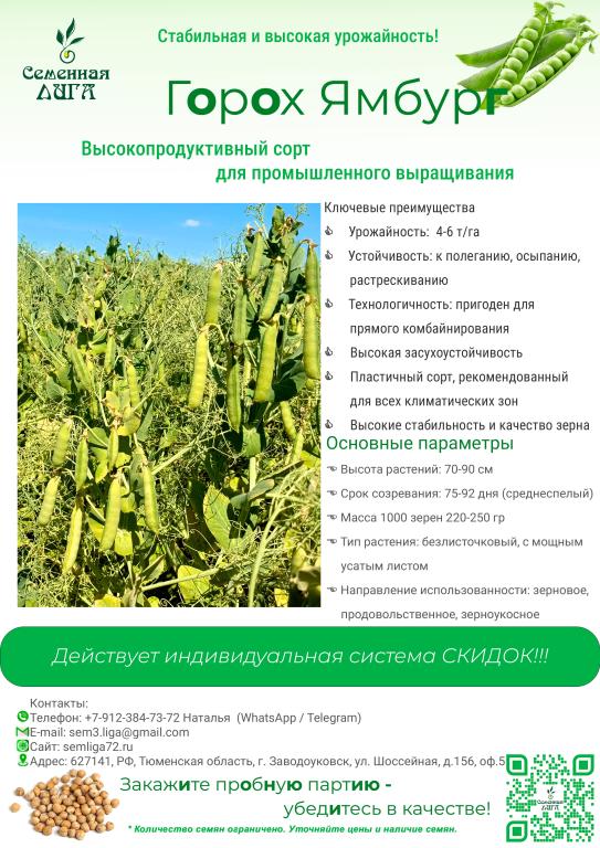 В 2024 году, на государственных сортоучастках, появился новый сорт гороха посевного ЯМБУРГ, где он проходит Государственные испытания. Сорт выведен специалистами Компании «Семенная Лига».