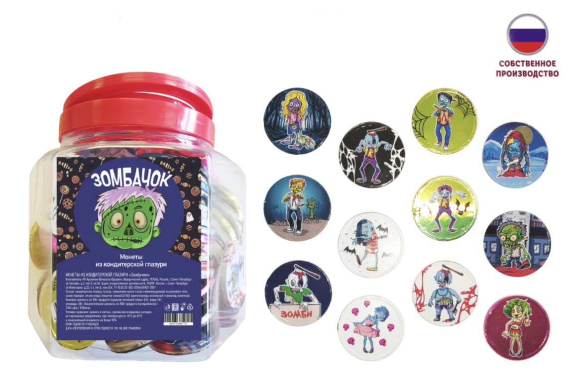 Каждая шоколадная монета упакована в индивидуальную фольгу, что делает продукт гигиеничным, удобным для продажи и раздачи.Такая яркая фольга на шоколадных монетах «Зомбачок» эффектно смотрятся на витрине, в подарочных наборах и на сладком столе, привлекая внимание покупателей и создавая атмосферу праздника.