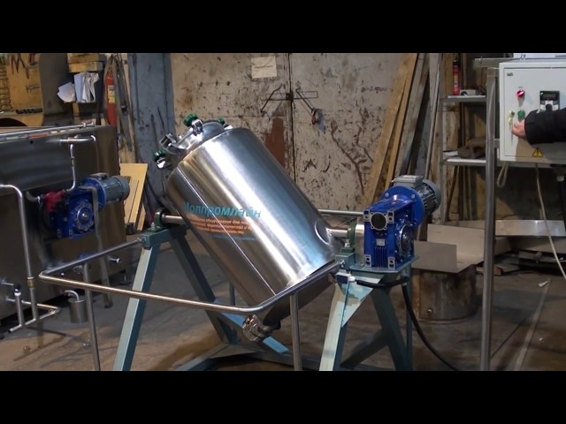 Смеситель типа «Пьяная бочка» используется для смешения сыпучих веществ, порошков, жидкостей. Область применения - химпром, косметическая и пищевая промышленность и пр. Конструкционно - бочка, вращающаяся под углом, привод от редуктора. Скорость вращения регулируется.