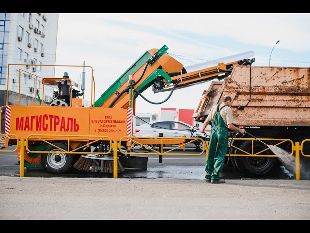 ПУМ-001 «Магистраль» прицепная подметально-уборочная машина элеваторного типа, с увлажнением убираемой поверхности Предназначена для тяжелой и скоростной уборки крупных транспортных магистралей и городских улиц, рыночных и привокзальных площадей.