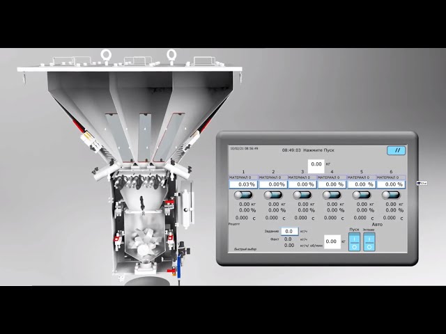 Принцип действия весовых дозаторов заключается в подаче партии материала, состоящей из компонентов, заранее определенного веса в соответствии с рецептурой. Материал подается во взвешивающий бункер, происходит взвешивание компонента, далее по очереди подаются и взвешивается следующие компоненты. После взвешивания всех компонентов, составляющих рецепт, происходит их перемешивание в смесителе. При достижении максимального веса во взвешенном смесителе открывается выпускная заслонка и материал высыпается в зону загрузки шнека.